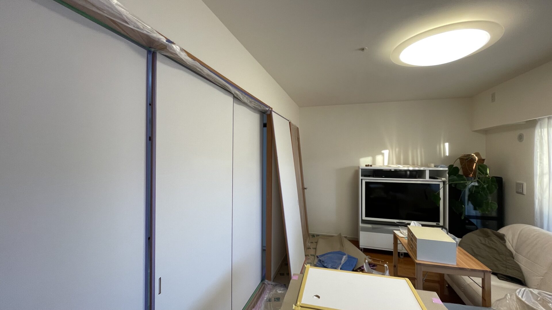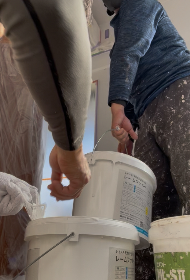 最終日に戸襖 の塗装をしているところ オガファーザースムーズ
